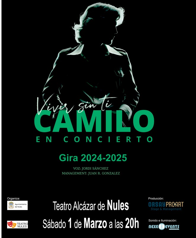 El pasado sábado 1 de marzo el espectáculo “Vivir Sin Ti, Camilo En Concierto” se dio cita en el Teatro Alcázar de Nules, donde volvió a dejar atónitos a sus más de quinientos asistentes con una espectacular puesta en escena con la Quini Orquesta y la magnífica voz del alcoyano Jordi San, interpretando las mejores canciones del mítico cantante, también alcoyano, Camilo Sesto.